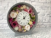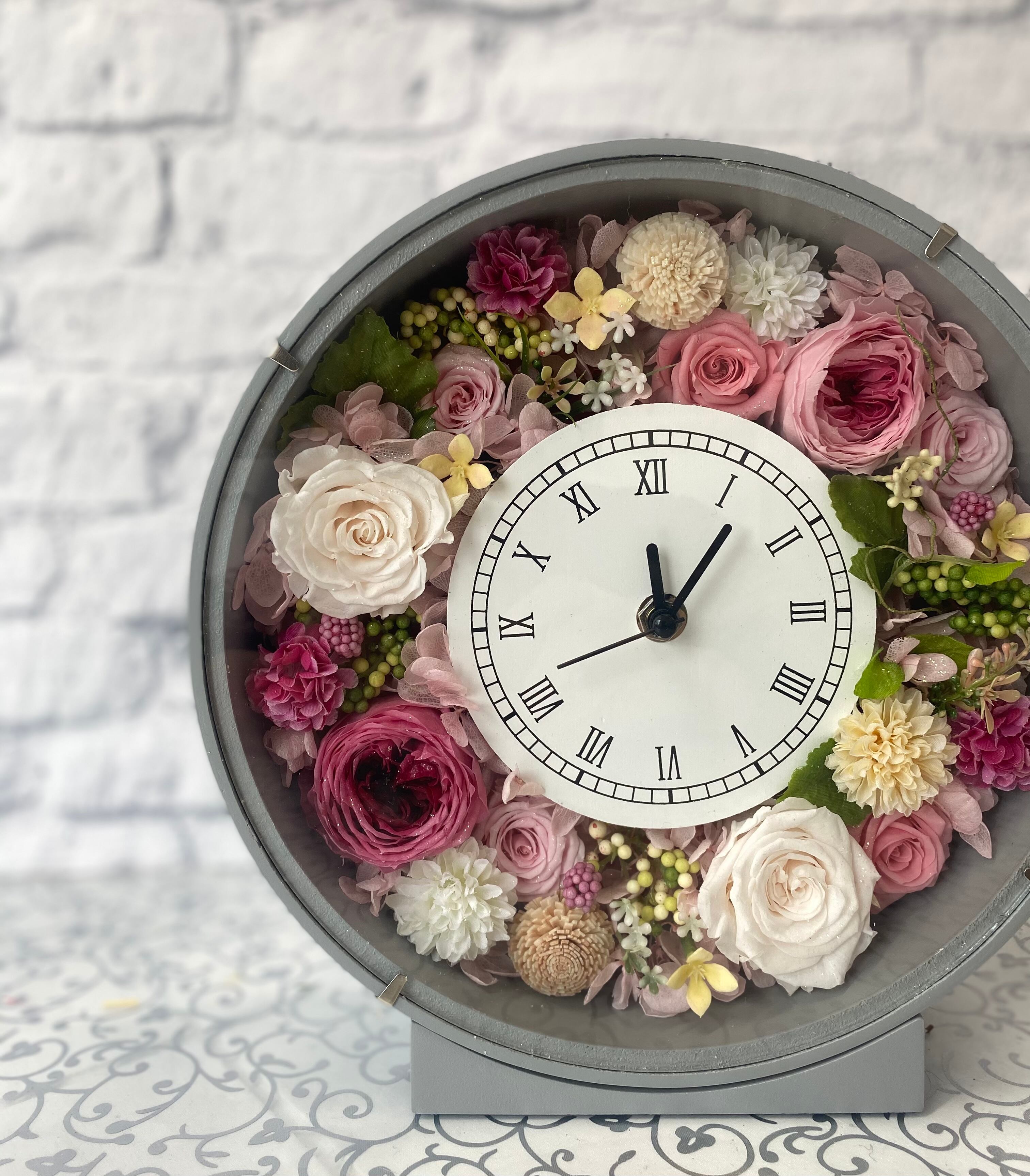 おしゃれなラウンド型の時計の花器にプリザーブドフラワーをいっぱいにアレンジしています。