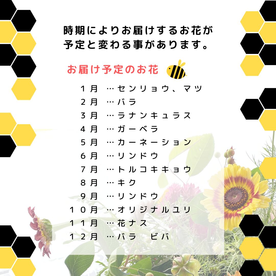 気候や天候により、お届けするお花が予定のお花と違う場合もございます。