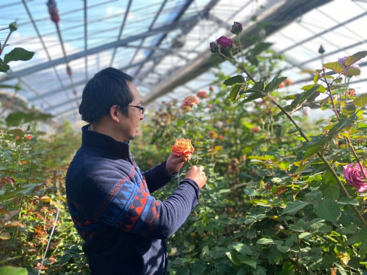 野菜、菊、その他色々な草花の生産を経て1986年にバラの生産を始めました。最初は土で栽培していましたが、1992年から水耕栽培に切り替え、2007年2代目、史さんが就農。ヒートポンプや栽培用補光装置、複合環境制御装置などの先端技術を取り入れ、現在IoTを使ったスマート農業を実践中です。